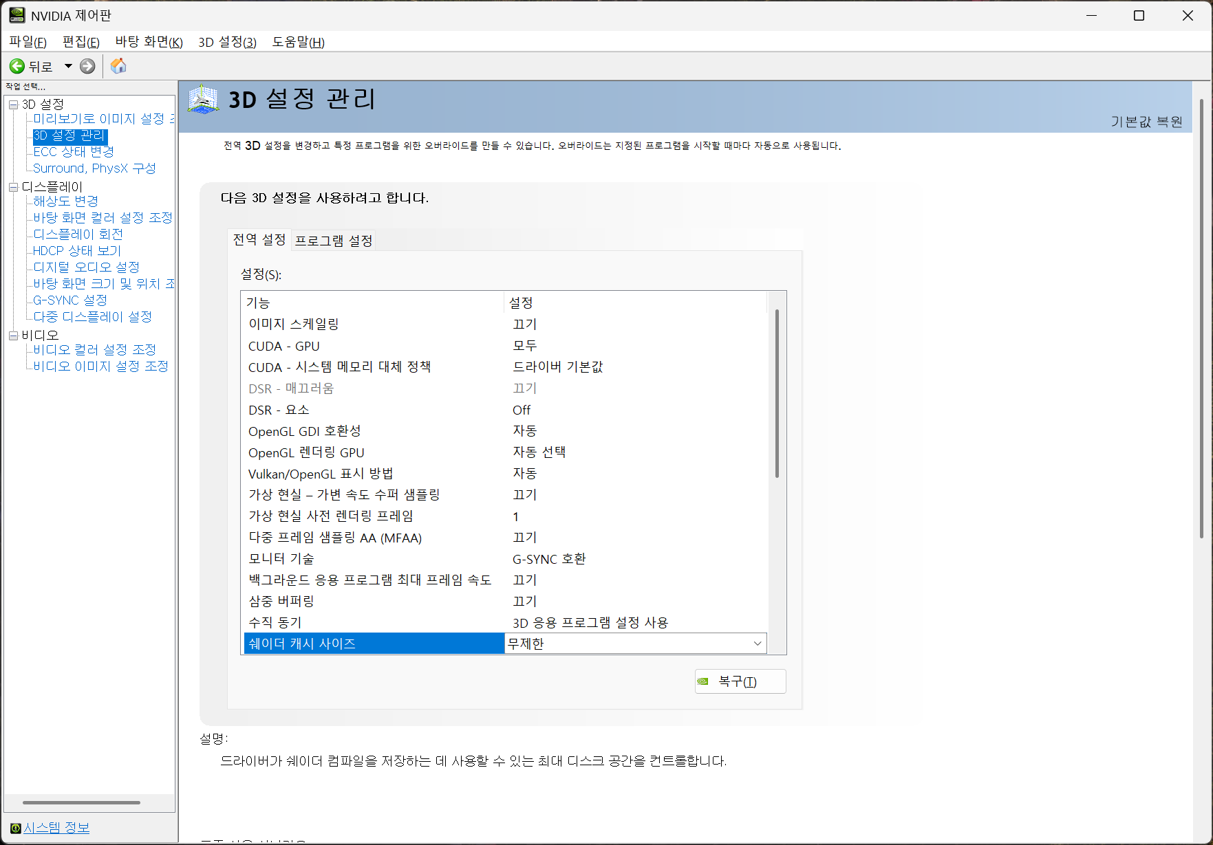 - 3D 설정 관리 ➞ 쉐이더 캐시 사이즈를 무제한으로 설정합니다.