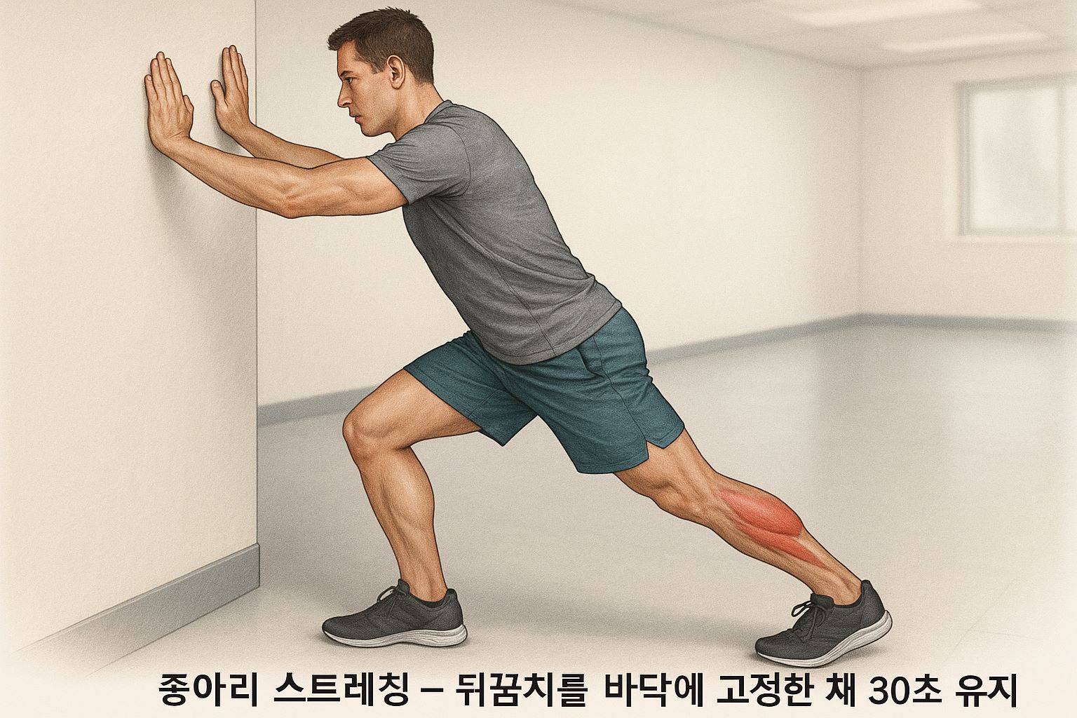 💡 운동 전 종아리 스트레칭 예시: 벽 밀기 자세에서 한쪽 다리를 뒤로 뻗고 뒤꿈치를 바닥에 고정해 30초 유지.